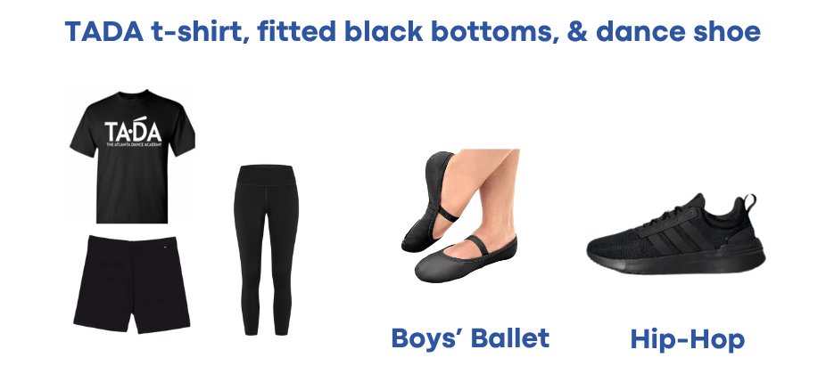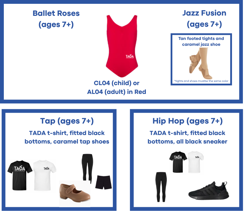 All Company members are required to have their base TADA Uniform for their weekly ballet technique classes. In addition, Company members must have a TADA shirt, TADA black sweatpants, and a TADA Youth Company Jacket. Info on ordering these is forthcoming.